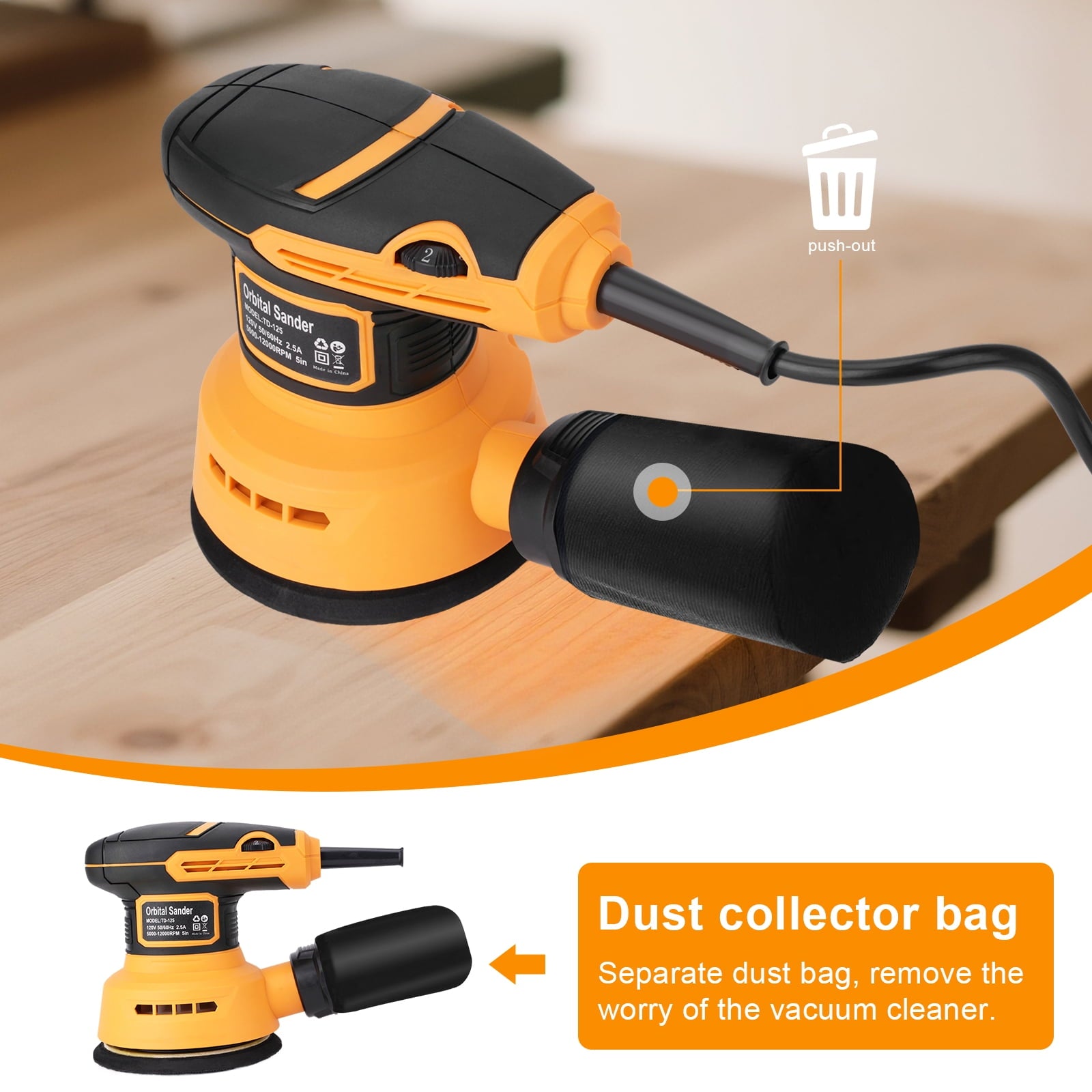 2.5Amp Orbital Sanders for Woodworking Capable of handling a wide range of sanding tasks and functions for long periods of time Powerful, pure copper motor , No Load speed up to 12,000 RPM Sanding Efficiency: ↑ 20% ┃ Service Life: ↑ 5 times ┃ Lower Tool Noise Hook and Loop System Power Sander is designed with self-adhesive discs for quick and easy paper changes and increased work efficiency.5 types of sandpaper (P80/P100/P120/P240/P400) are available for different surface accuracy. Dust Removal System Electric sander Built-in dust extraction system for fast and increased dust collection; dust bags are included to keep the work space clean. Cooling System Upper and lower air vents to avoid problems caused by the sanding machine being used for too long and the temperature rising.