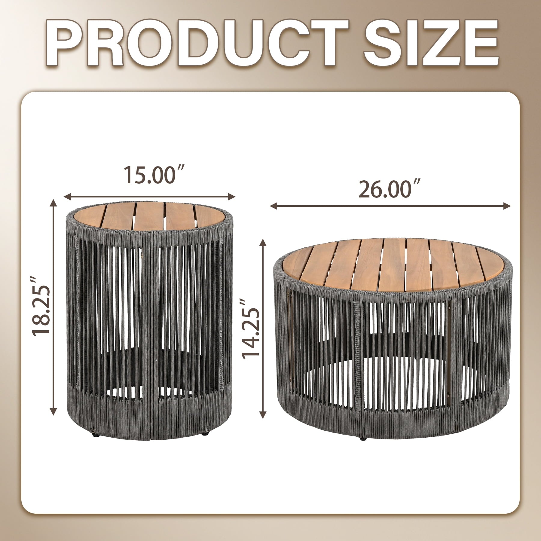 Dranite Rustic Industrial Table Set,Coffee Table & Side Table with Woven Rope Design, Sturdy and Easy Assembly,Wood Look Accent Furniture