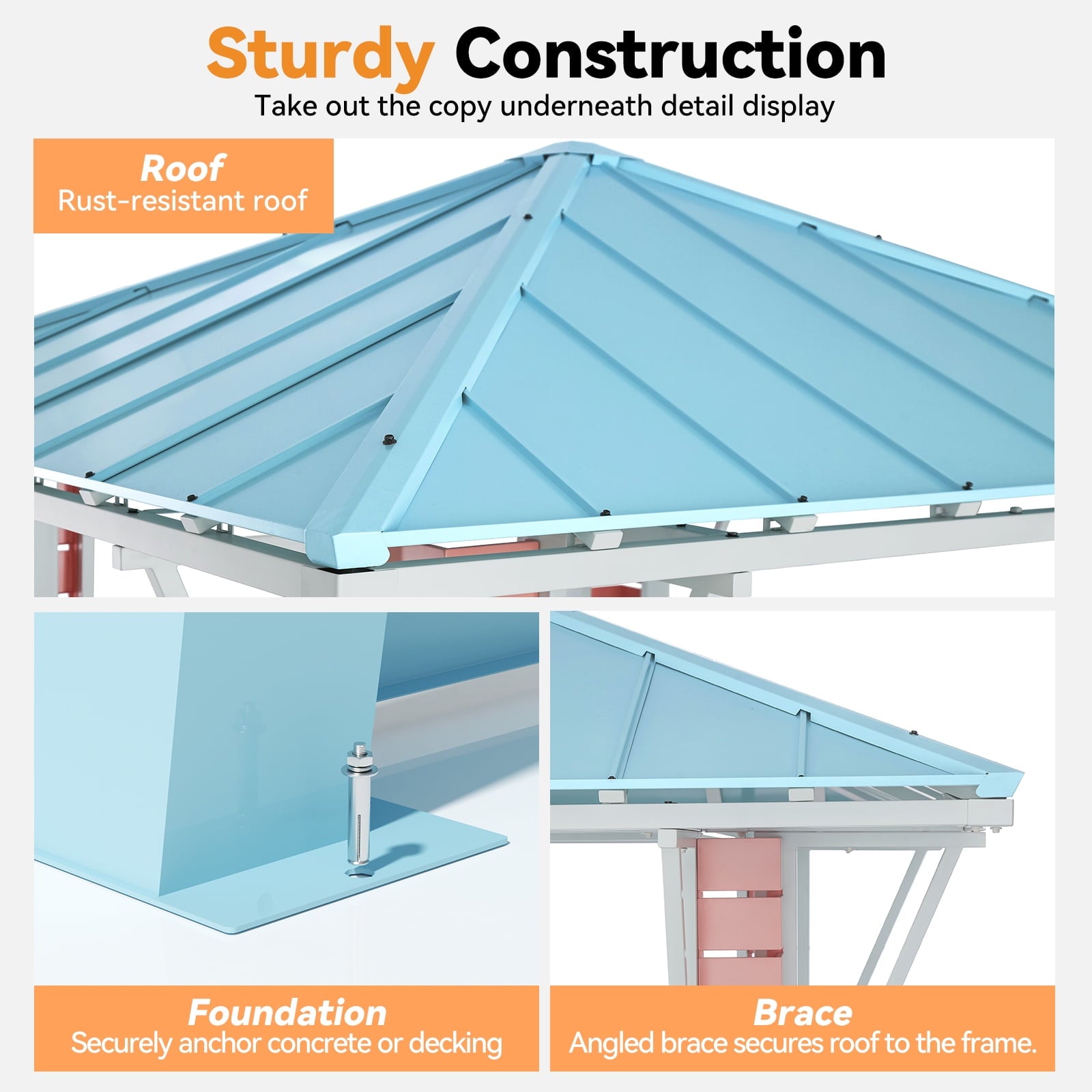 - [STURDY FIXTURES] The gazebo pavilion is equipped with sturdy hooks on the roof, perfect for hanging lights and fans, enhancing the ambiance of your coastal-inspired steel gazebo and creating a delightful outdoor retreat.