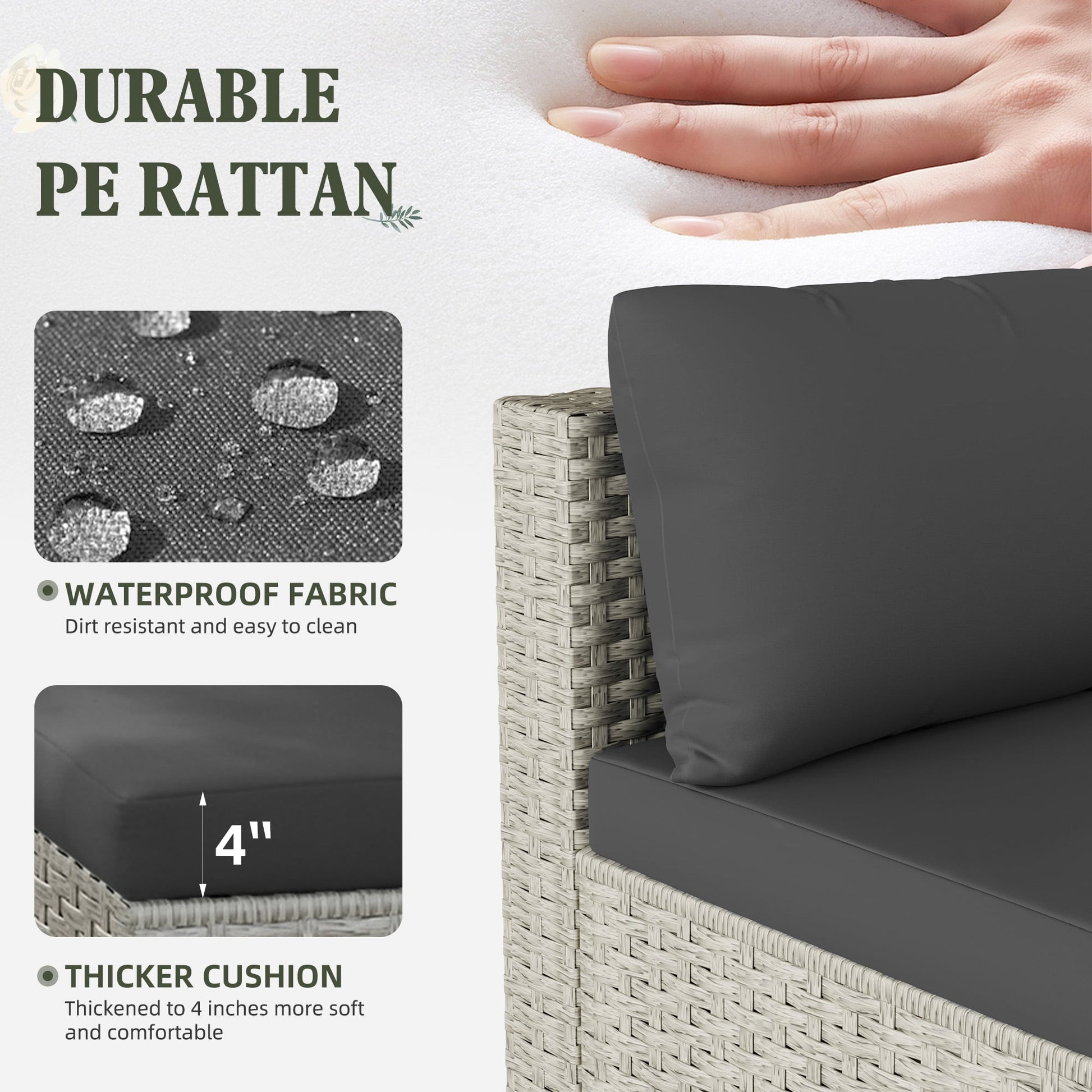 - This patio furniture set is made of PE rattan, which is UV-resistant and resists fading and brittleness. The seat cushions are made of high-quality, fade-resistant fabric and feature a convenient zipper design for easy removal, washing, and replacement. The base is stable and stays in place, providing a double layer of safety and comfort.